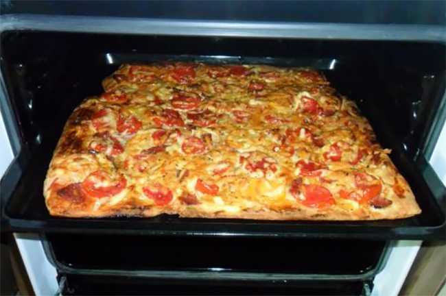 Ставим противень с пиццей в заранее разогретую духовку, пицца в духовке запекаем её 25 – 30 минут при температуре 200 градусов.