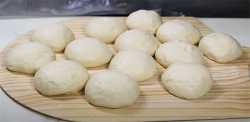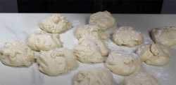 Стол и руки слегка смазываем подсолнечным маслом, перекладываем тесто, делим на кусочки по 80гр, слегка посыпаем их мукой и формируем колобочки.