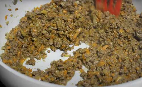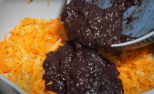 В сковороду наливаем подсолнечное масло, примерно 3 ст. ложки, закладываем лук, обжариваем в течение 30 секунд, добавляем морковь – жарим до золотистого цвета лука.