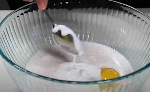 К молочно-дрожжевым ингредиентам добавляем: куриное яйцо, соль, кефир или сметану – перемешиваем. Помним, что продукты должны быть комнатной температуры.