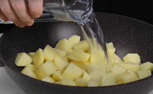 Клубни, промываем водой, очищаем от кожуры, нарезаем кусочками и варим в подсоленной воде до готовности.