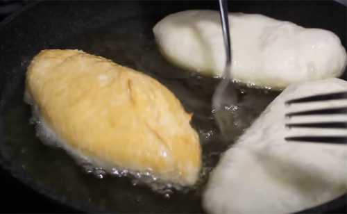 В сковороду наливаем подсолнечное масло, с таким расчётом, чтобы пирожки свободно в нём плавали, нагреваем, опускаем пирожки швом вниз и жарим с двух сторон на среднем огне до золотистого цвета.