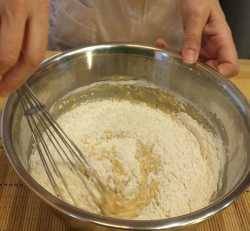 Засыпаем, частями, просеянную муку, хорошо перемешиваем, чтобы не было комков.