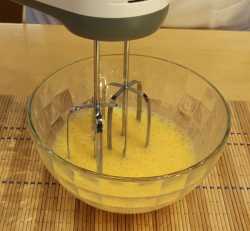 В отдельную миску разбиваем промытые куриные яйца и взбиваем до лёгкой, белой пены, при помощи миксера или венчика.