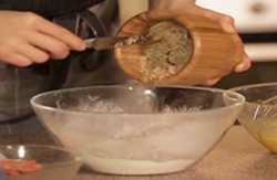 В миску просеиваем муку с разрыхлителем, добавляем измельчённые орехи и хорошо перемешиваем.