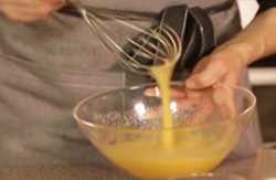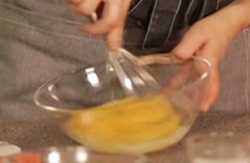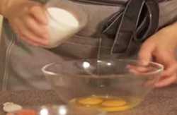 Куриные яйца промываем водой, разбиваем в миску, добавляем сахар песок частями и всё взбиваем, до пены средней консистенции.