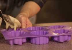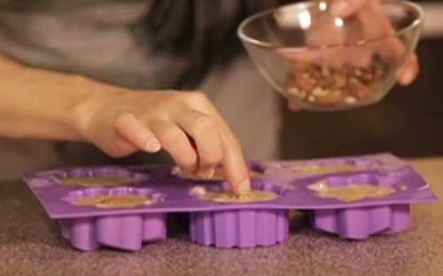 В каждую формочку достаточно положить по 2 ст. ложки теста, т.е. всё тесто должно поместиться в 6 формочек, а поверх разложить по кусочку ореха.