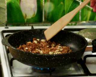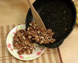 Ядра грецкого ореха выкладываем на сухую сковороду, включаем огонь и обжариваем его до лёгкого запаха, примерно 5-7 минут, при постоянном перемешивании.