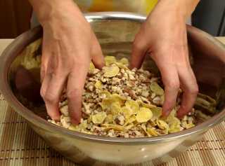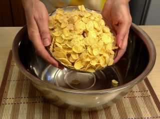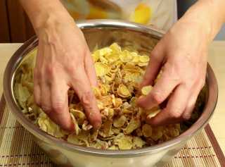 В миску, больших размеров, высыпаем кукурузные хлопья, выкладываем измельченный орех и слегка перемешиваем.