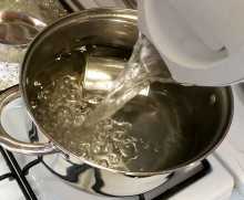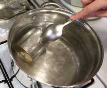 Сгущенка сварилась, опускаем её в холодную воду и охлаждаем 30-40 минут.
