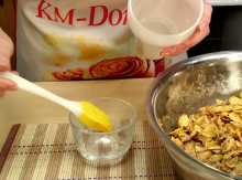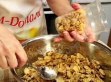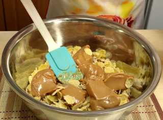 Выкладываем порциями варенную сгущенку и аккуратно, но тщательно её перемешиваем руками с хлопьями, только нужно стараться не поломать хлопья.