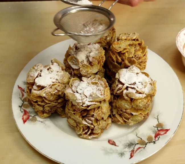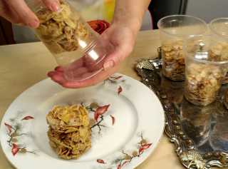 Данная сладость легка в приготовлении. Прекрасно подойдёт для праздничного и детского стола. Детям сладкий десерт очень понравится, т.к. сочетание хлопьев, орехов и вареной сгущенки создают идеальный вкусовой ансамбль.