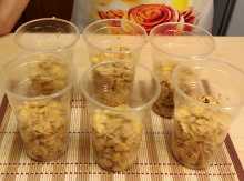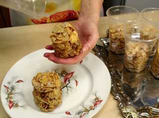 В качестве формы будем использовать высокие пластиковые стаканы, которые смазываем холодной, кипяченной водой и закладываем в них сладость на половину, при этом хлопья аккуратно применяем, чтобы сформировалась форма.