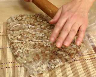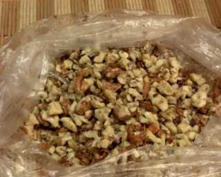 В плотный целлофановый пакет выкладываем орехи и при помощи скалки начинаем его прокатывать.
