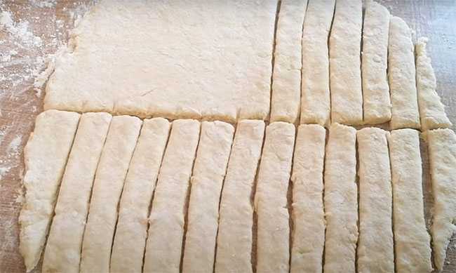 Пласт подготовили, и нарезаем его на палочки удобной формы.