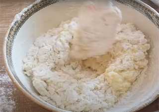 Добавляем просеянную муку, в три приёма, каждый раз хорошо вымешиваем каждую партию. Сначала, начинаем вымешивать при помощи лопаточки, а затем выкладываем на стол и замешиваем тесто до мягкой консистенции.