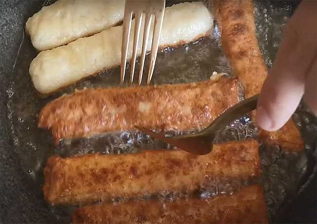 Сковороду ставим на плиту, наливаем подсолнечное масло, с таким расчётом, чтобы палочки в нем плавали, нагреваем и выкладываем партиями палочки.