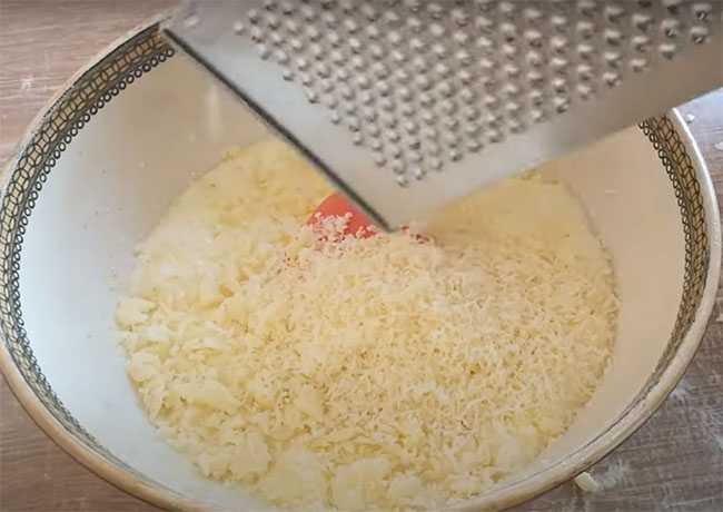 Сыр, натираем на мелкой или средней тёрке, добавляем в миску с тестом – перемешиваем.