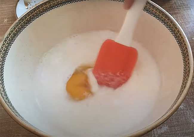 В миску выливаем кефир, добавляем сахар, соль, разрыхлитель теста, яйцо и перемешиваем тесто при помощи лопаточки, сильно взбивать не нужно. Если нет кефира, то его можно заменить: сметаной или простоквашей. Обратим внимание на то, что продукты должны быть комнатной температуры.