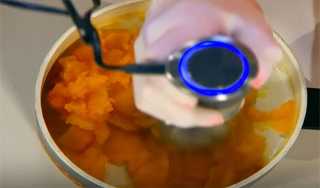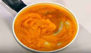 С тыквы сливаем воду, перетираем в пюре при помощи блендера, добавляем карамель и перемешиваем.