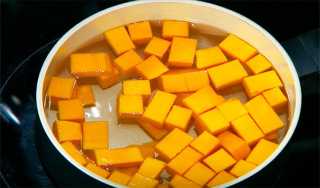 В кастрюлю наливаем воду, доводим до кипения, закладываем в неё порезанную тыкву, доводим воду до кипения, уменьшаем огонь и варим при малом кипении 20 минут.