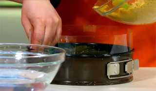 В форму для запекания вставляем ацетатную пленку, но прежде форму нужно сбрызнуть водой, для лучшего прилипания пленки. Если нет возможности приобрести такую пленку, то можно простелить форму пищевой плёнкой.