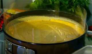 Песочная основа охладилась, заливаем в неё сливочно-тыквенную массу и отправляем чизкейк в холодильник на 6 часов.