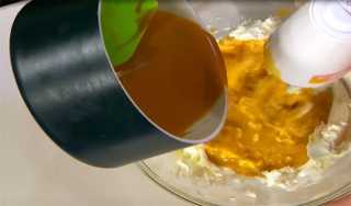 Сливочный крем взбиваем миксером и порциями вводим в него тыквенную массу.