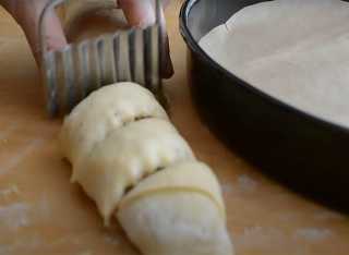 Тесто слегка обминаем и раскатываем в пласт толщиной 0,5 см.