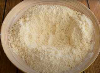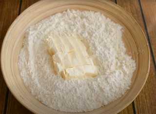 В муку добавляем слегка размягчённый маргарин и перетираем до мелкой крошки, но делать это нужно быстро, чтобы маргарин полностью не растаял.