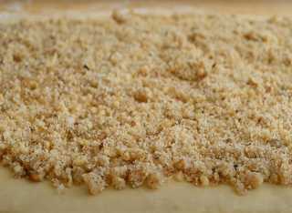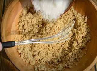 К измельченным орехам добавляем: сахар, ванилин, кардамон, корицу, мускатный орех - перемешиваем, а в конце яйцо(белок) – перемешиваем.