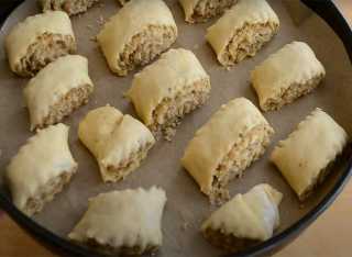 Нарезаем рулет на кусочки, перекладываем на противень, покрытый пергаментной бумагой, смазываем пахлаву яичным желтком и отправляем в заранее разогретую духовку.