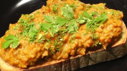 2. Готовится он очень даже просто. Для этого на растительном масле обжариваем кусочек чёрного хлеба, любой формы, остужаем и намазываем ровным слоем баклажанную икру. Сверху посыпаем измельчённой петрушкой, и всю эту композицию накрываем тонким кружочком помидора.