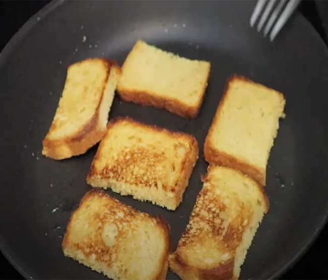 На сковороду выкладываем сливочное масло, нагреваем его и выкладываем белый хлеб, который предварительно нарезали ломтиками.