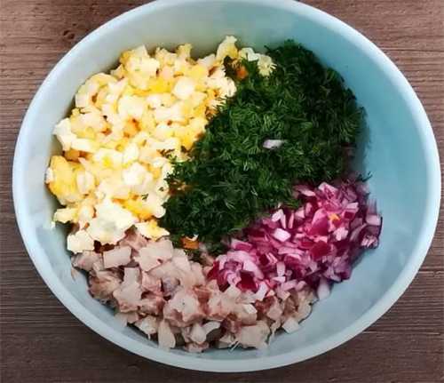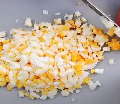 Куриные яйца, промываем водой, отвариваем вкрутую, остужаем, очищаем от скорлупы, нарезаем мелкими кубиками и выкладываем в миску к селёдке.