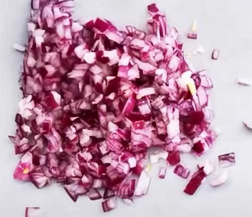 Репчатый лук очищаем от шелухи, промываем водой и измельчаем мелкими кубиками. Затем, его солим по вкусу, добавляем уксус 6% - перемешиваем и отправляем к остальным ингредиентам. Лучше взять красный сорт лука, он менее острый.