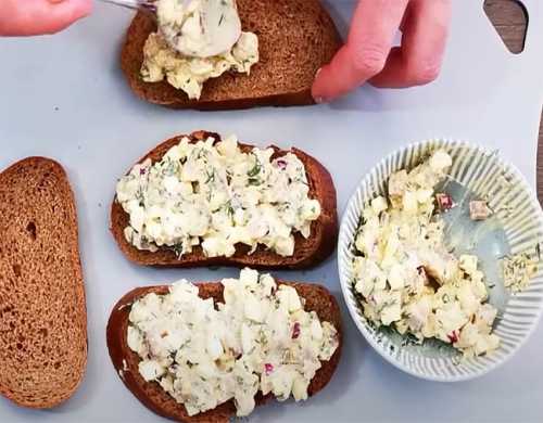 Получается 4 кусочка. Накладываем начинку на хлеб, украшаем веточкой укропа и подаём к столу. Бутерброды с яйцом, бутерброды с селёдкой готовы.