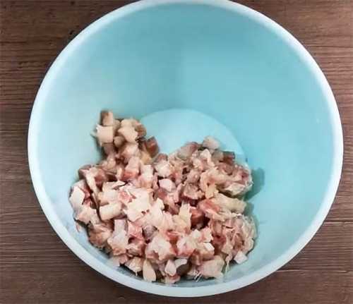 Малосольную сельдь, освобождаем от внутренностей, костей и распускаем на филе. Филе нарезаем мелкими кубиками и перекладываем в миску.